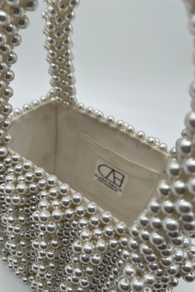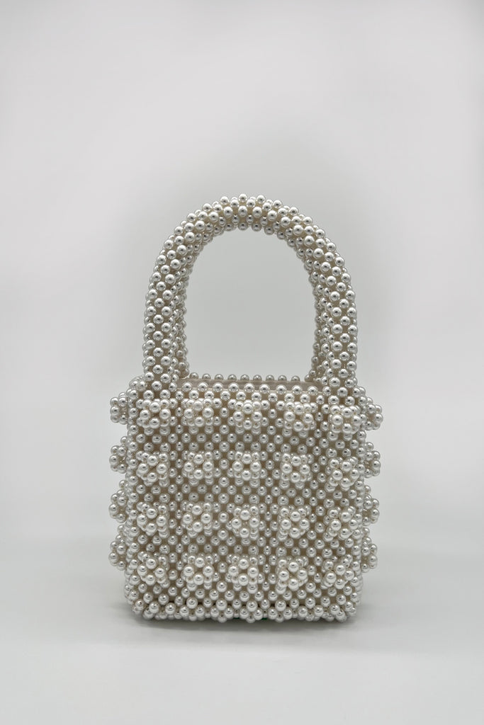 This Cocktail bag "Snow" is handmade with love in Munich. The boxy shape comes in white pearls and same colored grid set cluster.