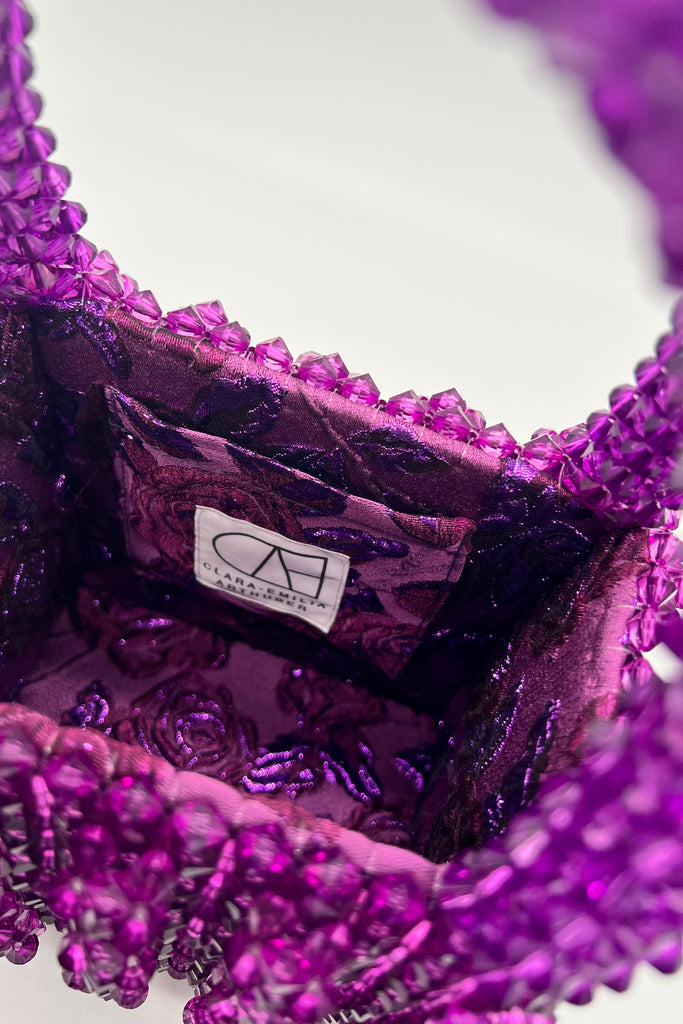 This Crystal bag "Midnight" is handmade with love in Munich. The boxy shape comes purple pearls and same colored grid set cluster.
